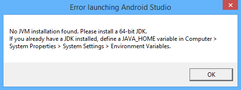6. The error above is because Android Studio cannot locate the JDK directory on your computer. So the first thing you have to do is make sure you have a JDK (not just JRE) downloaded to your computer. The three most common places in your computer are: C:\Program Files (x86)\Java\ (32-bit), C:\Program Files\Java\ (64-bit) or (unlikely) C:\Java\. Make sure that inside the Java folder, you have a JDK downloaded (not just a JRE).