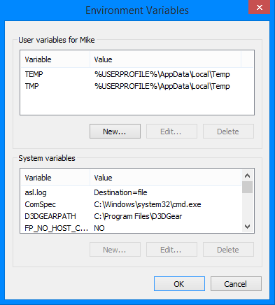 You should at least have TEMP and TMP variables. If you don't have a JAVA_HOME variable, click "New..." and create one with the variable name as JAVA_HOME and the variable value as the location of your JDK folder. For example, the value might be C:\Program Files\Java\jdk1.8.0_31. You can copy that location in Windows Explorer by navigating to it and copying the address bar. Make sure the you are using backslashes.